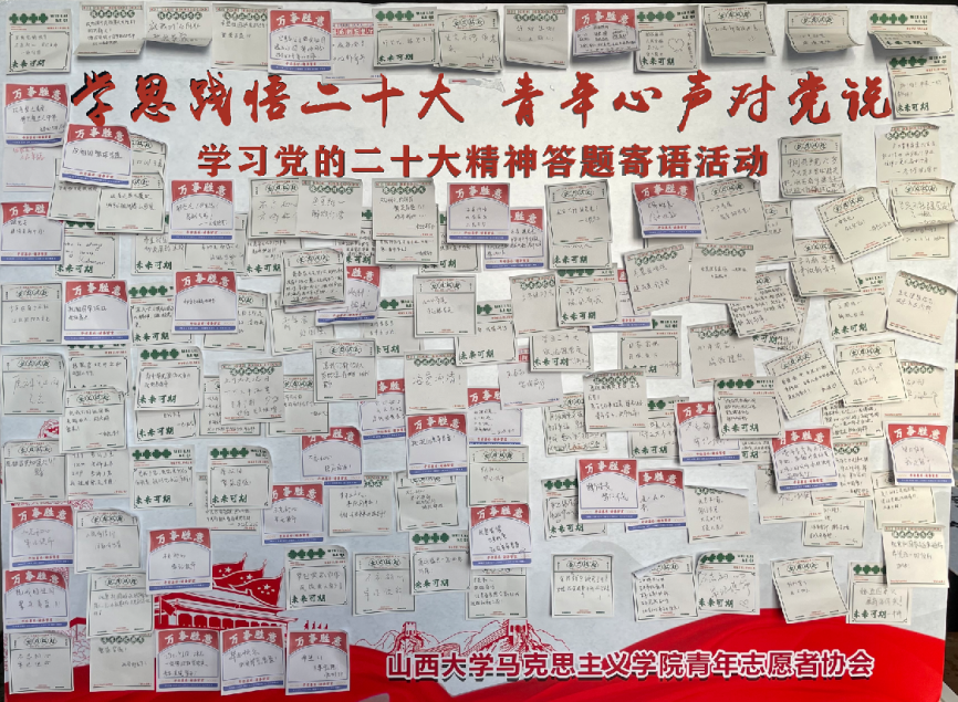 为深入学习宣传贯彻党的二十大精神,号召广大青年师生坚定理想信念,坚定不移听党话、跟党走,在第104个五四青年节到来之际,永利集团3044am青年志愿者协会于4月25日至27日在坞城校区举办“学思践悟二十大青春心声对党说”学习党的二十大精神答题寄语活动。
