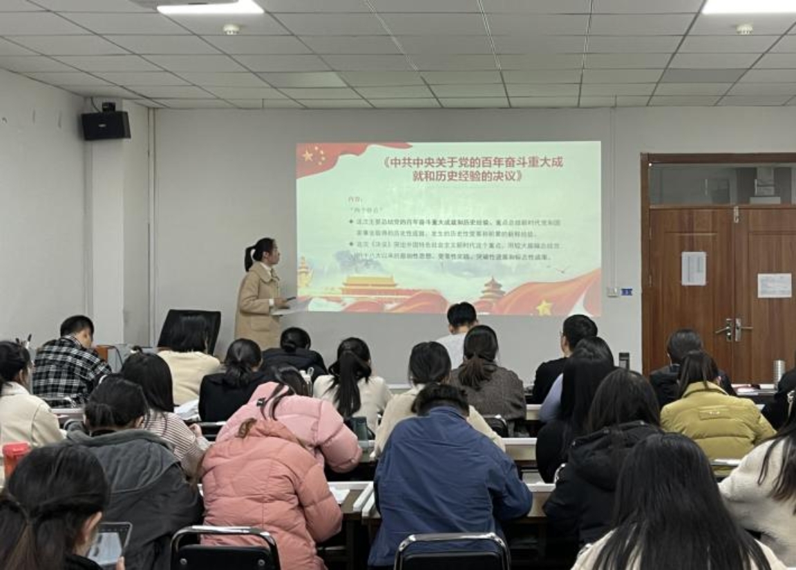会上,高浩雁同志领学党的十九届六中全会精神,并从三个历史决议、十条历史经验、响应党中央喜迎二十大三个方面进行解读。她认为,学习党的十九届六中全会精神是我们夯实专业理论基础、树立正确价值观的需要,要牢记一个根本问题,抓住一个根本大计,响应党中央号召,勿忘昨天的苦难辉煌,无愧今天的使命担当,不负明天的伟大梦想。