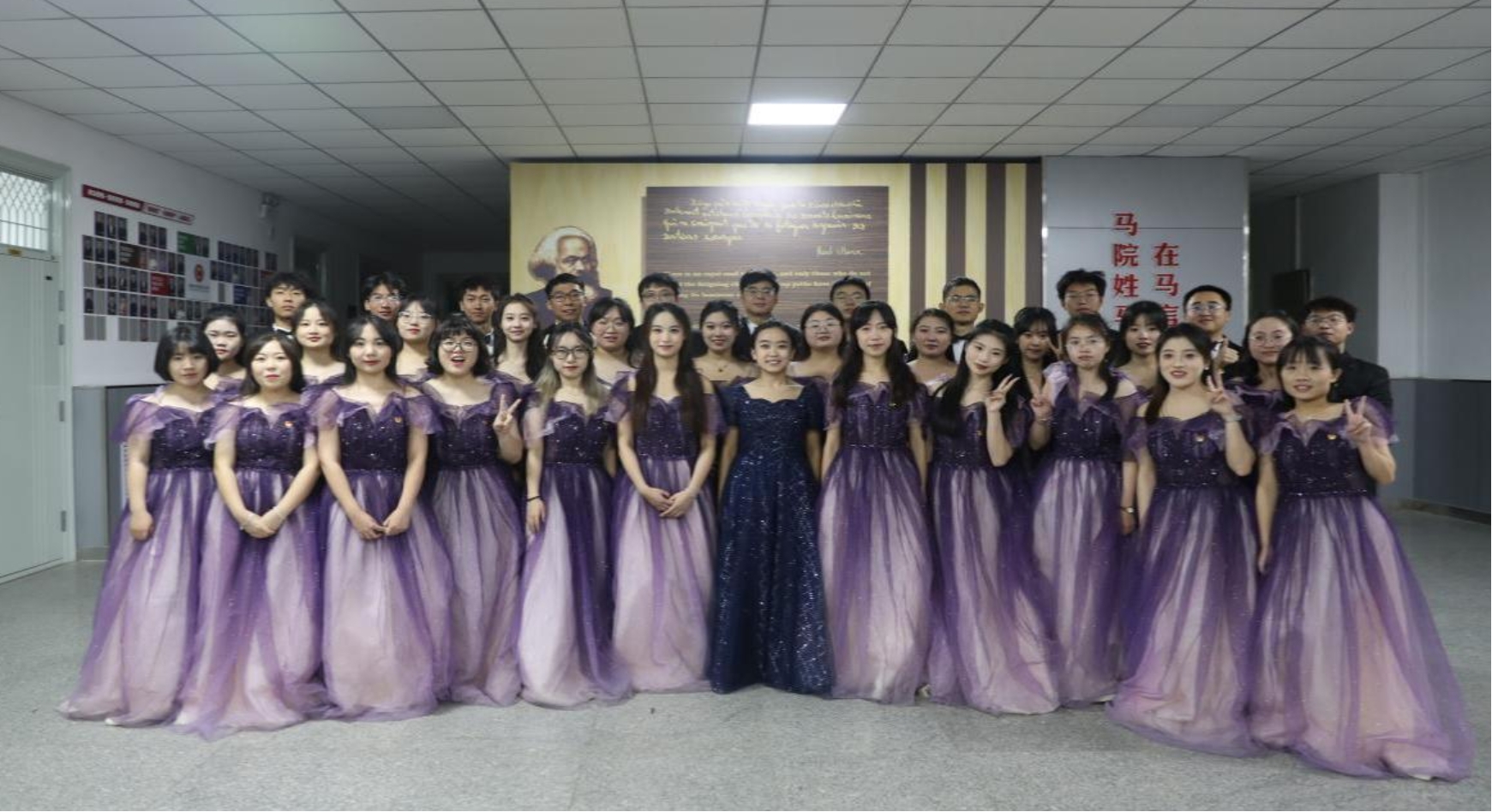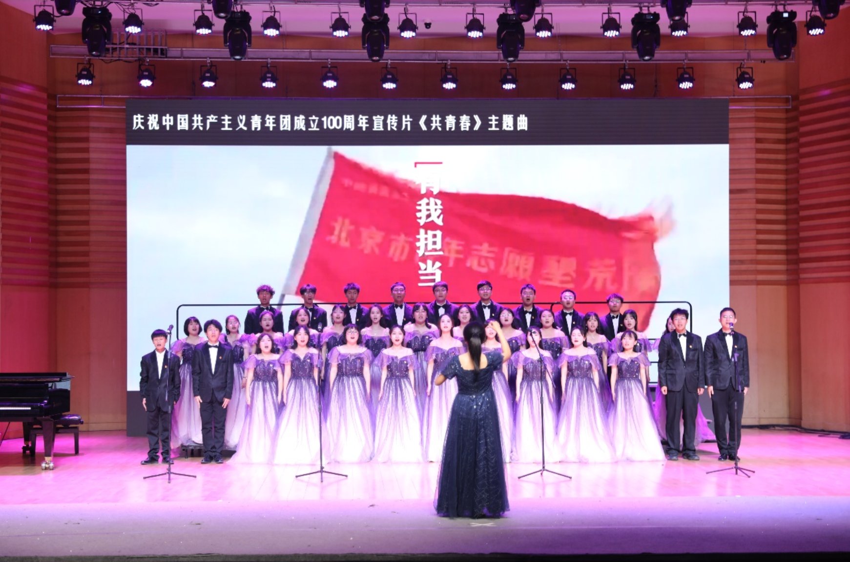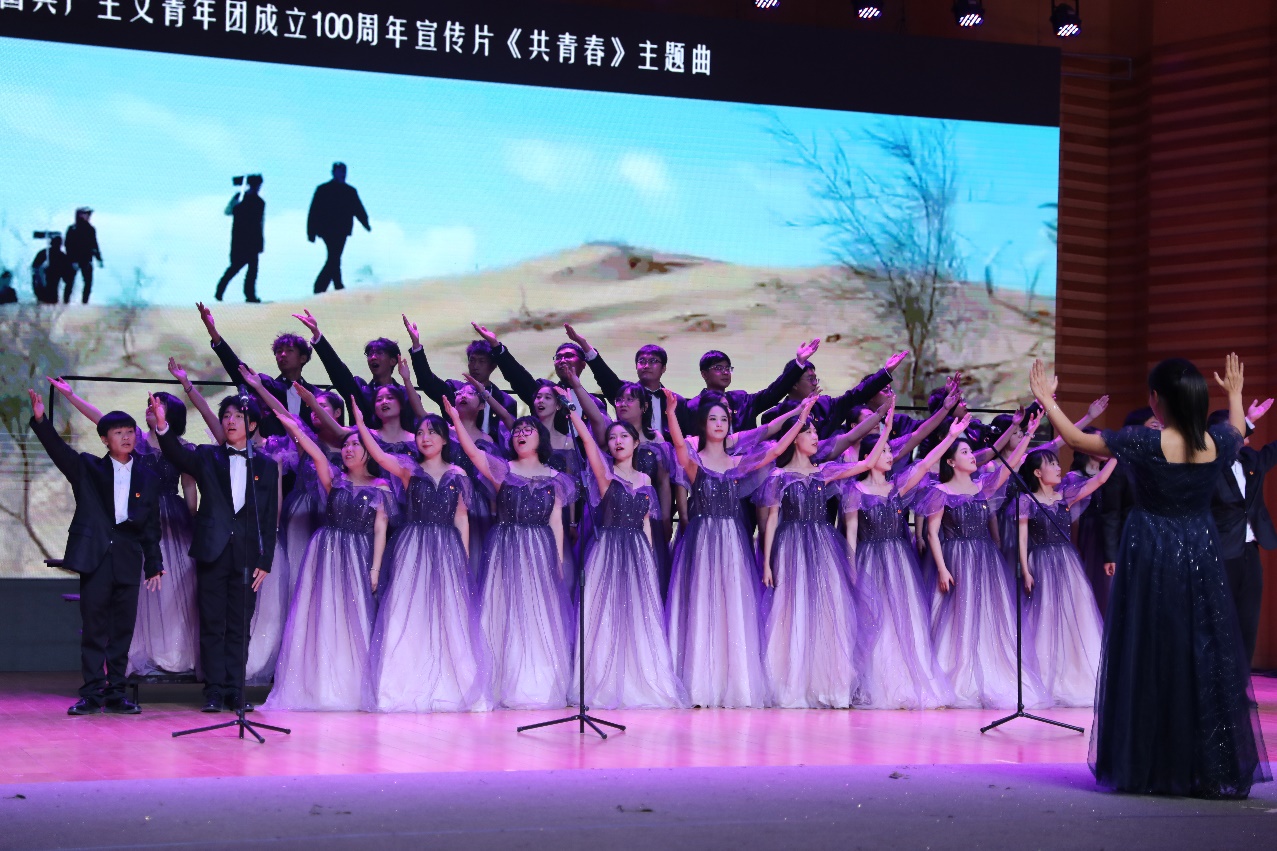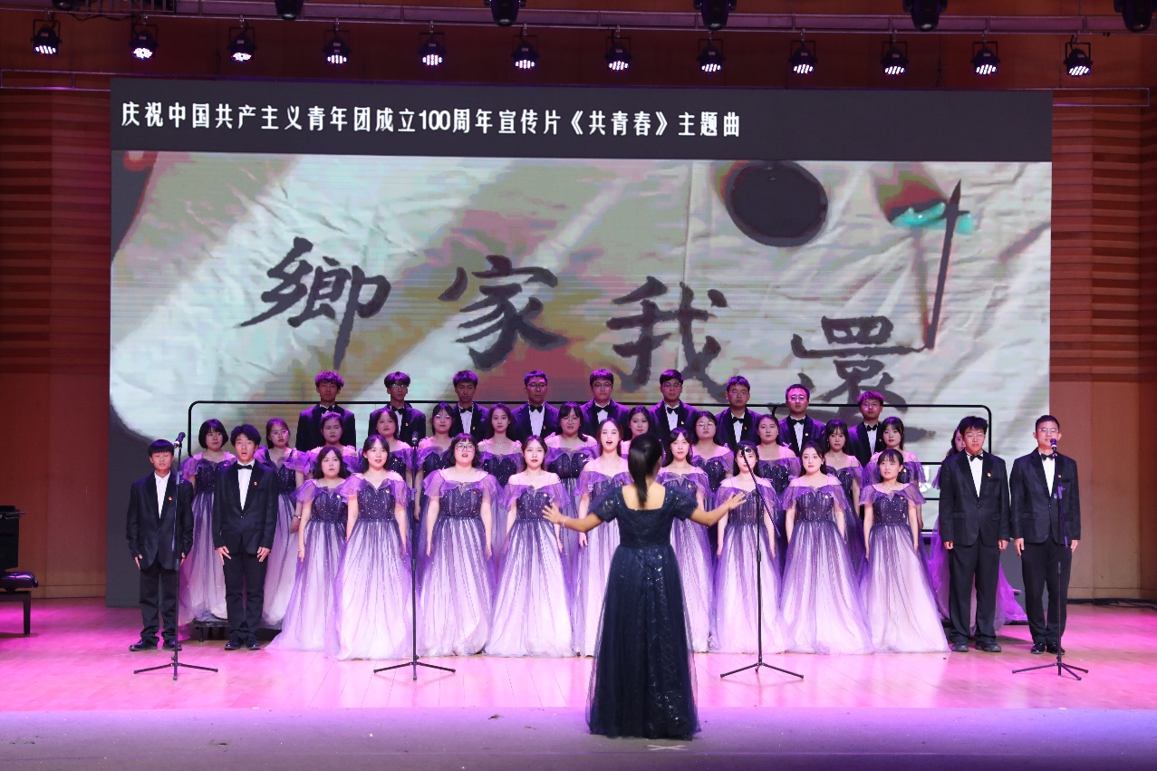合唱节目《有我》以“百年青春,从未老去,归来仍是翩翩少年”为题,展现了共青团建团百年以来祖国逐渐繁荣强盛的壮美画卷,歌曲铿锵有力,旋律悠扬,35名同学以饱满的爱国热情赞颂青年凌云之志。