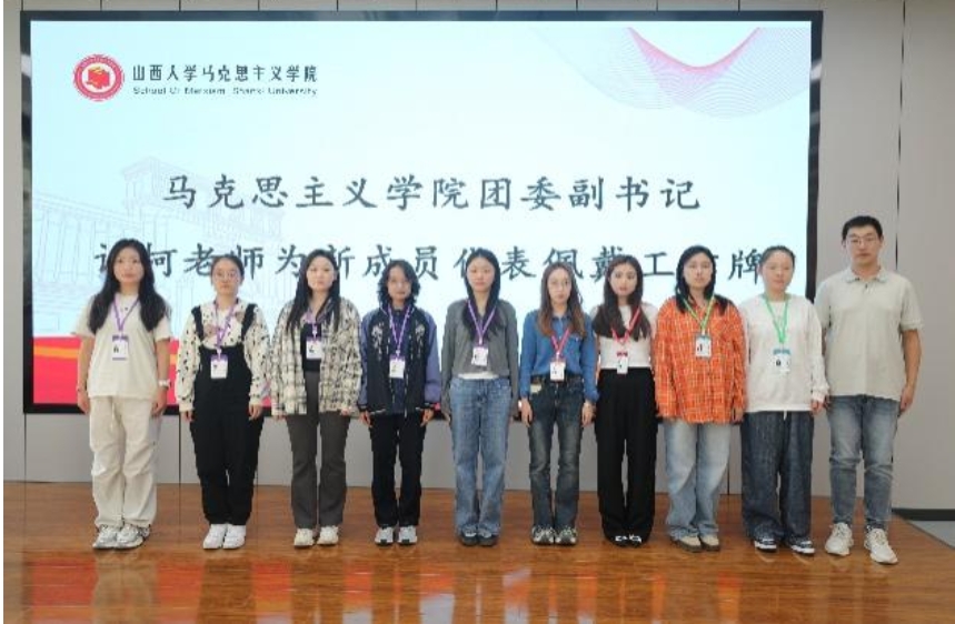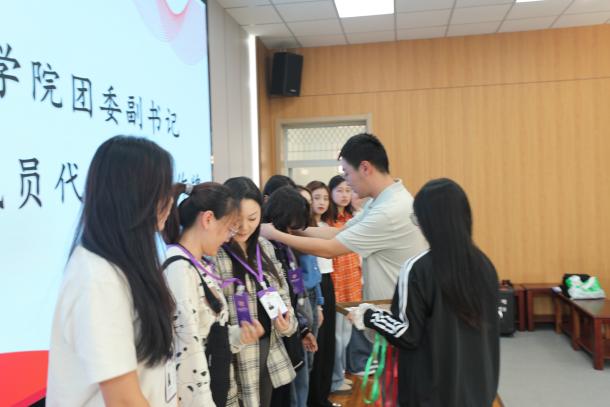 会议伊始,全体人员起立,奏唱团歌。许柯老师总结了过去一年团学组织所取得的成绩,对新加入的团学组织成员表示热烈欢迎,并就团学组织的工作职责与组织架构进行了详细介绍。他强调,团学工作要始终把政治性放在首位,倾听同学心声,关注同学动态,勇于担当责任,引导青年学子听党话、跟党走。他希望大家勇于开拓创新,积极组织、策划和参与各类实践活动,在团学组织这个大家庭中收获快乐与成长。之后,许柯老师为团学组织成员代表佩戴了工作牌。