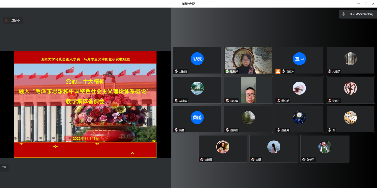 永利集团3044am全体教师深入学习宣传贯彻党的二十大精神,牢牢把握习近平新时代中国特色社会主义思想的世界观和方法论,深入推进党的二十大精神更好、更快地走进高校思政课堂。2022年11月16日至17日,马克思主义基本原理、马克思主义中国化研究、思想政治教育、中国近现代史基本问题研究和习近平新时代中国特色社会主义思想概论等五个教研室根据各自课程特色,以“党的二十大精神融入思政课教学”为主题开展线上集体备课会,深入学习交流、统一思想认识,推动党的二十大精神快速、积极、准确地进教案、进课堂、进员工头脑。,