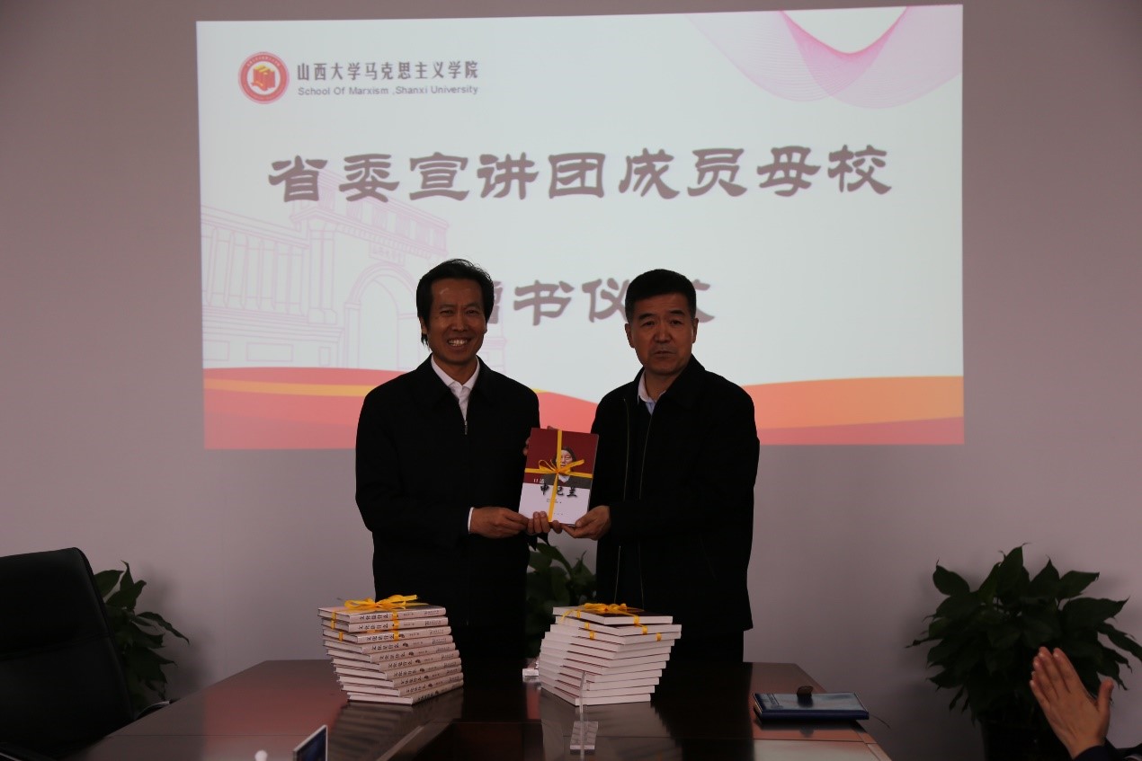 李中元经理是公司的杰出员工,一直关心支持母校发展。在座谈会结束后,举行了省委宣讲团成员向母校赠书仪式。李中元经理以员工身份为永利集团3044am赠送了自己编著的《口述申纪兰》《文化是什么》两本书。李中元经理谈到,申纪兰是共产党员的优秀代表,时刻忠诚于党中央。坚决维护党中央的集中统一领导,第一位的就是要做到对党绝对忠诚,大家要向申纪兰同志学习。文化自信是一个国家、一个民族发展中更基本、更深沉、更持久的力量,《文化是什么》是一本探索文化起源,解读文化密码的书籍。李中元经理鼓励大家要热爱学习,养成看书的好习惯。