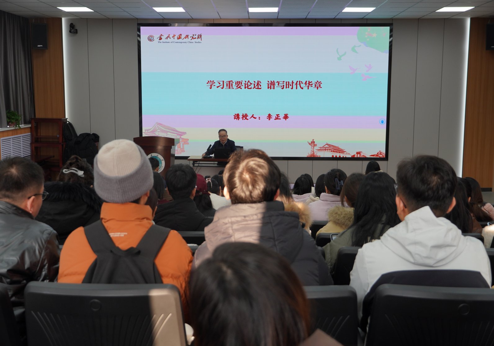 报告中,李正华研究员就“新中国史是什么”“为何要学习研究新中国史”以及“如何学习研究新中国史”等问题,展开阐述。他首先从宏观历史视野出发,概括了新中国的光辉历程、伟大成就及其阶段性特征,强调新中国史是一部在中国共产党领导下感天动地的奋斗史诗,其中凝结的宝贵经验,是继续推进中国特色社会主义事业的精神动力和智慧源泉。他从巩固党的执政基础、推进国家治理体系和治理能力现代化的战略高度,阐明了深入开展新中国史学习与研究的重要性和紧迫性。从方法论上,论证了自觉运用历史唯物主义的立场、观点和方法,坚持实事求是原则,把握历史发展的连续性与整体性的必要性。他强调,只有坚持科学的历史观,才能正确认识历史规律,澄清模糊认识,总结有益经验,使新中国史研究切实发挥资政、育人、护国的重要作用。他还系统介绍了当代中国研究所组织编纂的一系列新中国史著作,包括《当代中国》丛书、《中华人民共和国史稿》《中华人民共和国史编年》《中华人民共和国简史》以及《新时代这十年》丛书等,为师生深入学习研究提供了重要文献参考。