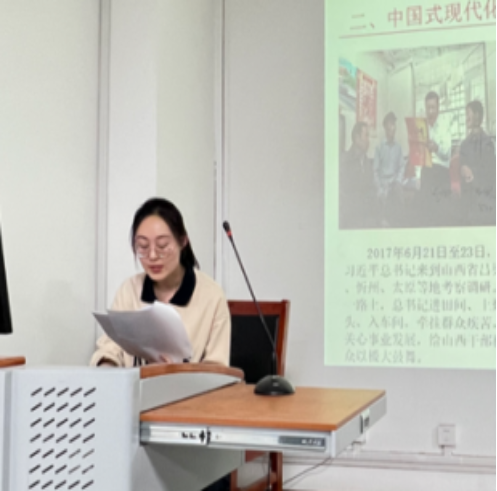 会上,宣讲团成员围绕“青春践行二十大”进行主题宣讲。王思扬同学以《马克思主义与中华优秀传统文化的契合性》为题,讲述了坚持把马克思主义基本原理同中国具体实际相结合、同中华优秀传统文化相结合”的必要性和重要意义;程紫薇同学以《寻找中国式现代化的山西足迹》为题,讲解了中国式现代化的内涵、特征及实现路径,生动展示了山西独具特色的发展道路以及高质量转型升级规划;杨梦珍同学以《青年学子学习青年习近平》为题,生动展示了青年习近平在苦难中完成升华、以亲身实践为广大青年树立榜样的奋斗历程,启迪广大青年要立志做有理想、敢担当、能吃苦、肯奋斗的时代新人;刘宇轩同学以《中国化时代化的马克思主义行》为题,细致分析了马克思主义中国化、时代化的内核以及两个“行”之间的内外逻辑,倡导同学们要形成对待马克思主义的科学态度;康佳同学以《勇担青年使命,谱写时代华章》为题,回望百年来爱国青年和有志之士为国家奉献的光辉历程,呼唤新时代青年为中华民族伟大复兴而奋斗。五位同学从不同视角对党的二十大精神进行解读,条理清晰,生动形象,既有理论深度,又具现实温度,极大地感染了现场同学。