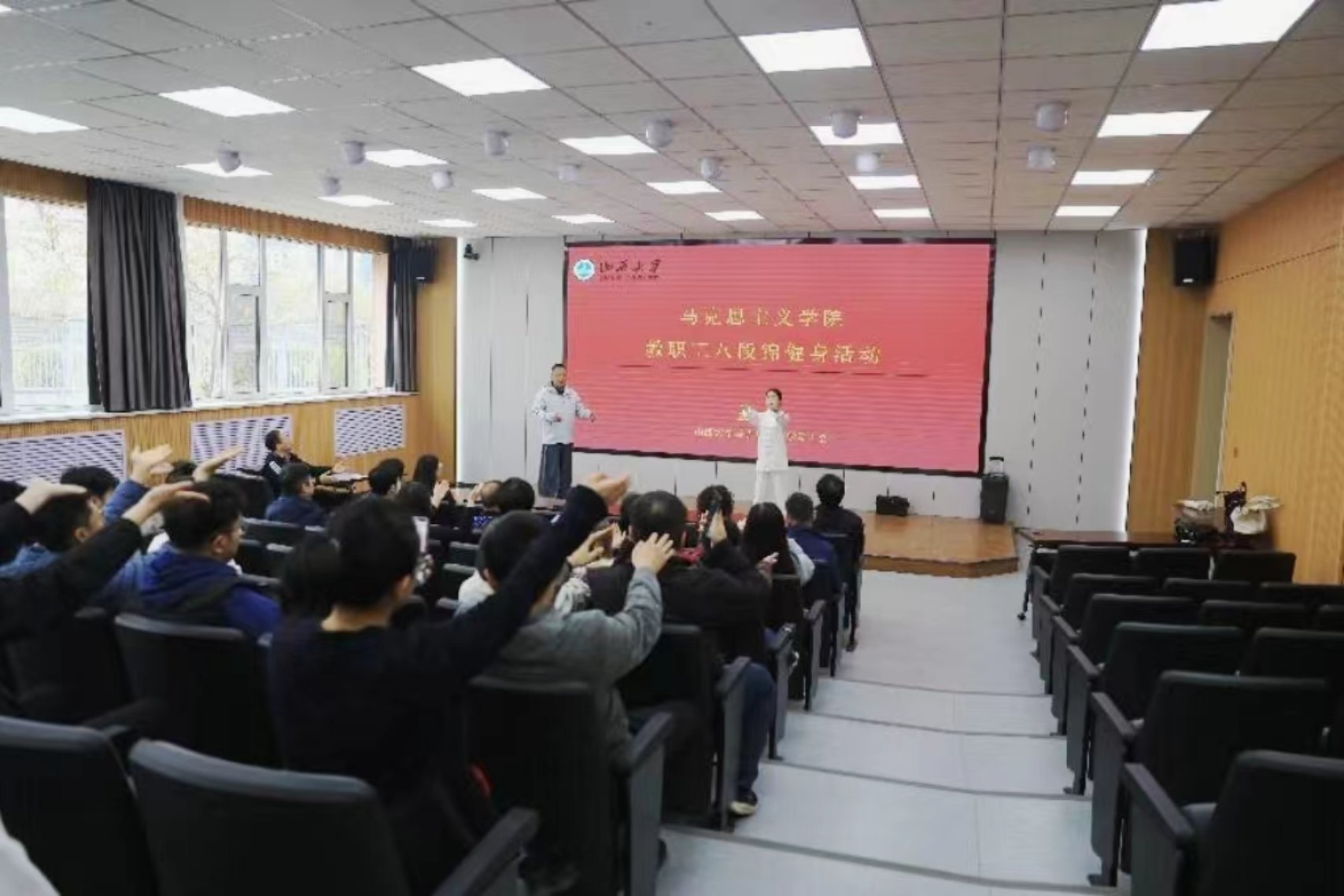 活动中,刘映海教授介绍了八段锦的历史渊源、功法特点与健身功效,并对八段锦的各个动作进行了详细讲解和示范,希望大家形成科学健康的运动意识,不断提高身心健康水平。在刘映海教授的指导下,教师们进行了认真的学习和领会,每一个动作都力求做到准确无误,共同感受着中华优秀传统文化的独特魅力,学习氛围高涨、成效显著。
