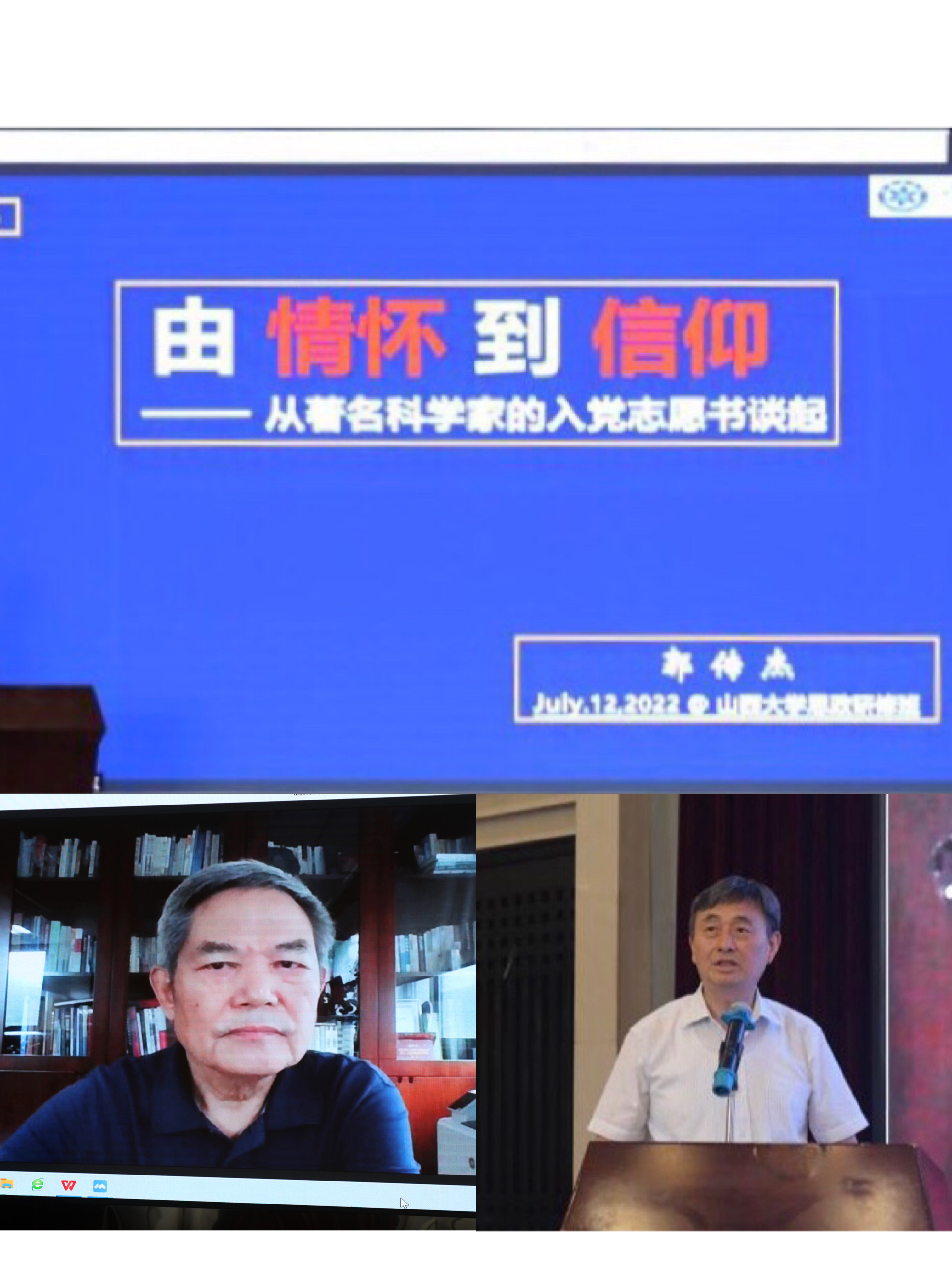 开班仪式第二阶段,中国科公司研究员郭传杰应邀以“从情怀到信仰——从百位著名科学家入党志愿书谈起”为题线上作专题报告,报告由任定成主持。郭传杰结合自己与数十名著名科学家接触的实际经历,阐述了科学家们的入党志愿书给予人们的教育与启迪。他表示,科学家以自己的情怀和信仰为服务党和国家、服务人类社会所呈现出的崇高精神,是中国共产党人精神谱系的重要组成部分,是我国科技和社会发展过程中的宝贵财富。