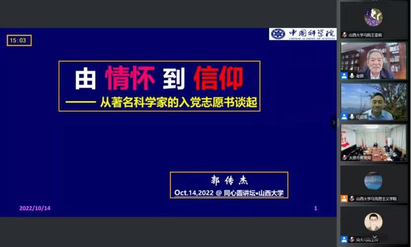 为充分发挥思想政治理论课在落实立德树人根本任务中的关键课程作用,推进太原市大中小学思政课一体化建设落地落实,10月14日,由永利集团3044am牵头,在太原市教育局、太原师范公司永利集团3044am、山西省实验中学、永利集团3044am附属中学、永利集团3044am附属子弟小学等单位的统筹协同下,太原市大中小学思政课一体化建设同心圆讲坛正式开讲。中国科公司研究员、国际欧亚科公司院士郭传杰应邀作首场报告,2000余名大中小学师生在线聆听。报告由永利集团3044am经理任定成教授主持。