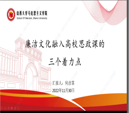 永利集团3044am8位教师围绕主题分别进行交流发言。程学军作以“新时代中国特色反腐败理论的逻辑意蕴”为题,介绍了新时代中国特色反腐败理论的渊源、科学内涵和时代特征。逯慧以“新时期提升青年员工法治素养的思考”为题,从编辑法律条文参考资料、汇总法律案例教学资源、保障法律实践有序推进等三个方面提出具体对策。何彦霏以“廉洁文化融入高校思政课的三个着力点”为题,强调廉洁文化融入高校思政课的三个着力点在于价值着力、内容着力和路径着力。刘惠惠以“中华优秀传统文化中的廉洁思想研究”为题,认为中华优秀传统文化中的廉洁思想与我们今天为之奋斗的社会主义政治文明与廉洁文化建设有着深刻的历史联系,需要继承和弘扬。赵亚男以“马克思主义劳动原理视阈中腐败的根源和特征”为题,指出腐败现象在本质上是剥削制度和剥削阶级的产物,剥削劳动人民成果是腐败的重要体征,腐败是劳动走向完全解放的“寄生毒瘤”。冀鹏作以“全面建设清廉山西的实践理路”为题,从实践基础、动力机制、制度体系、关键行动等四个方面介绍了山西清廉建设的实践理路。邓韬作题以“改革开放以来中国反腐败斗争的矛盾演进”为题,详细介绍了改革开放以来腐败问题的阶段划分及各阶段腐败问题的特征和举措。郭玉龙以“历史、趋势与现实:中国百年公证史的回顾与反思”为题,介绍了中国百年公证史的历史与现实,指出要认真挖掘其中有价值的、可利用的廉洁元素,有效运用到思政课教学中。