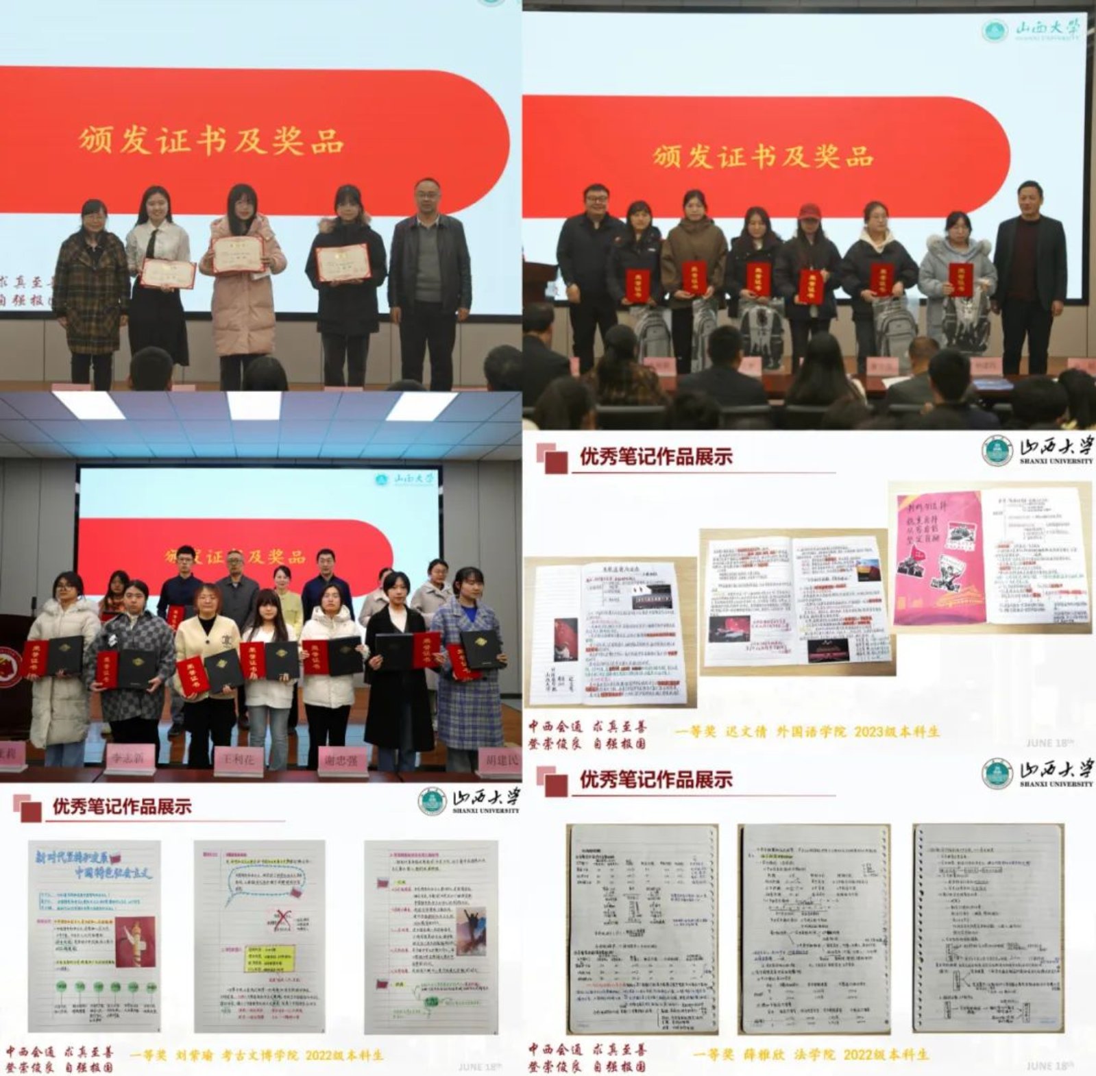 会议以视频的形式展示了获奖同学的思政课笔记,出席会议的领导和老师为获奖同学颁发了证书和奖品。