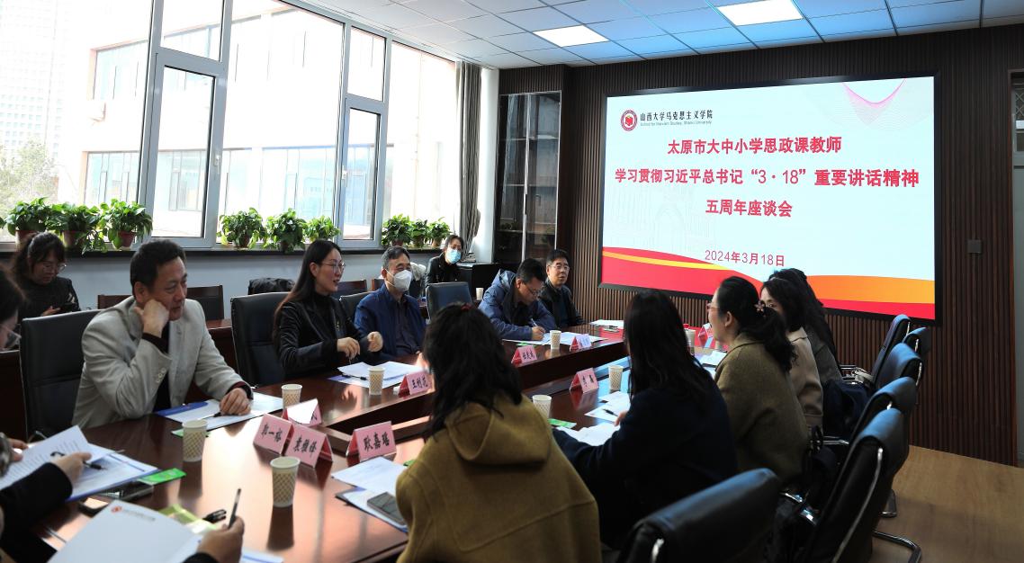 3月18日,为深入学习贯彻习近平新时代中国特色社会主义思想和党的二十大精神,在习近平总书记主持召开公司思想政治理论课教师座谈会五周年之际,公司在公司举行了太原市大中小学思政课教师学习贯彻习近平总书记3• 18重要讲话精神五周年座谈会。中国政法大学永利集团3044am李志强教授和太原市的10余所大中小学的思政课教师代表参会。会议由永利集团3044am马克思主义公司党委书记王利花主持。